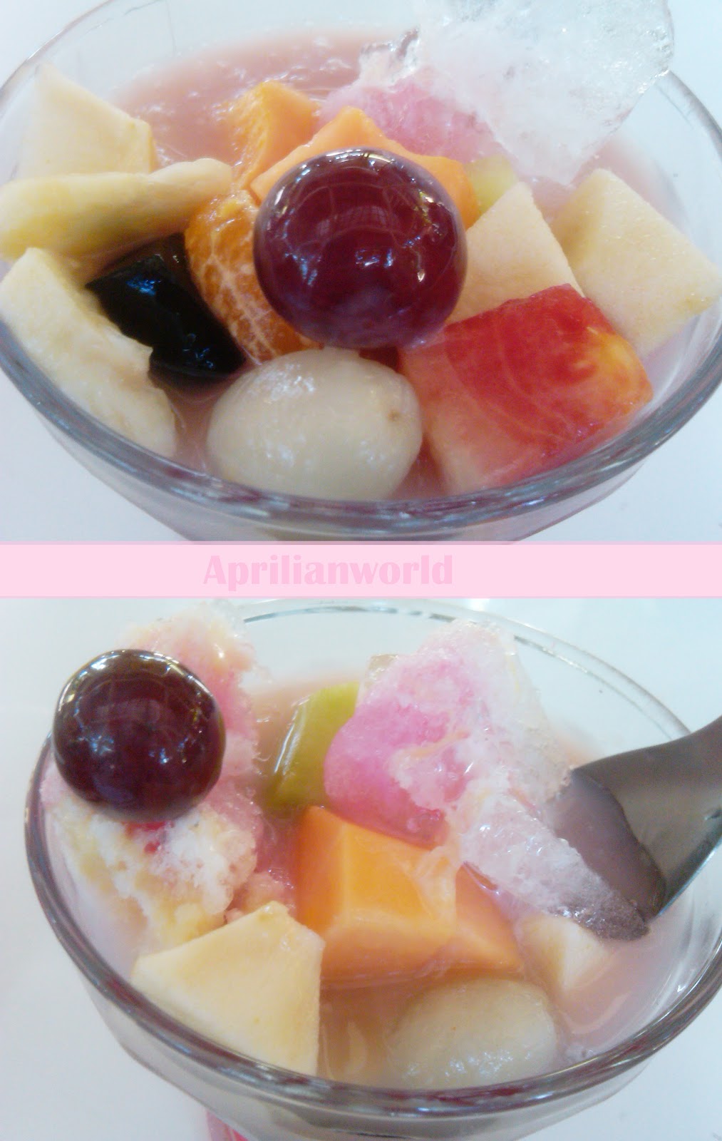 Yesterday I went out alone to buy my favorite summer drinks. What is it? Yeah, a bowl of fruit soup. I often spend time to enjoy it. It’s not too sweet, but very fresh. Melon, orange, papaya, grape, rambutan, a pear, a little syrup, milk and ice was very enjoyable. I really like all things in this summer.